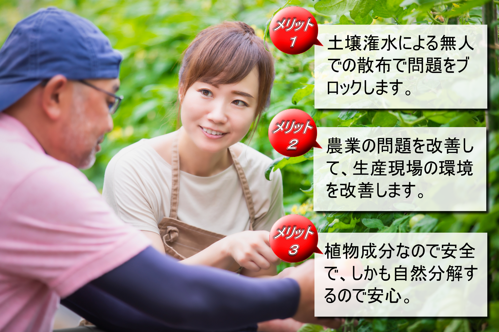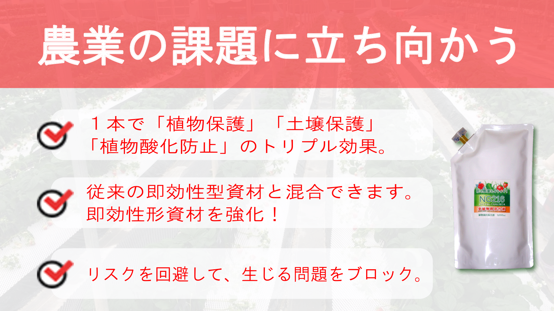 NG216は、農作物の生産現場で生じるもろもろの問題を改善するために、ニーム(ニームオイル)をはじめとした数種の植物抽出物を配合した資材です。生産現場の環境が改善され付加価値の