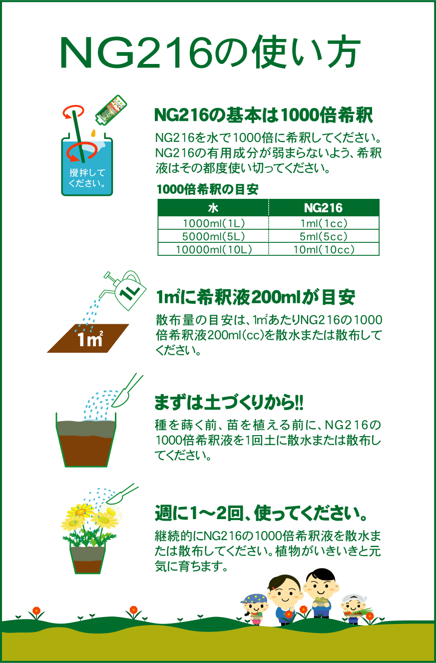 NG216は、農作物の生産現場で生じるもろもろの問題を改善するために、ニーム(ニームオイル)をはじめとした数種の植物抽出物を配合した資材です。生産現場の環境が改善され付加価値の